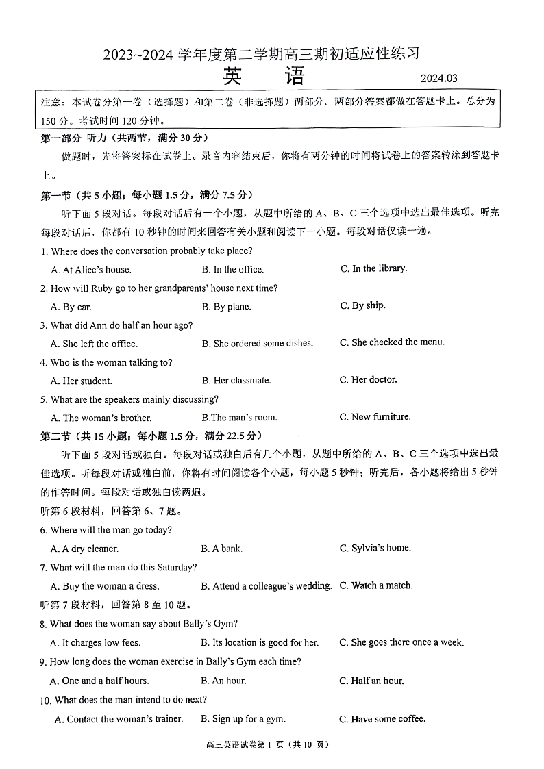 江苏省镇江市2024届高三下学期期初适应性练习英语+答案