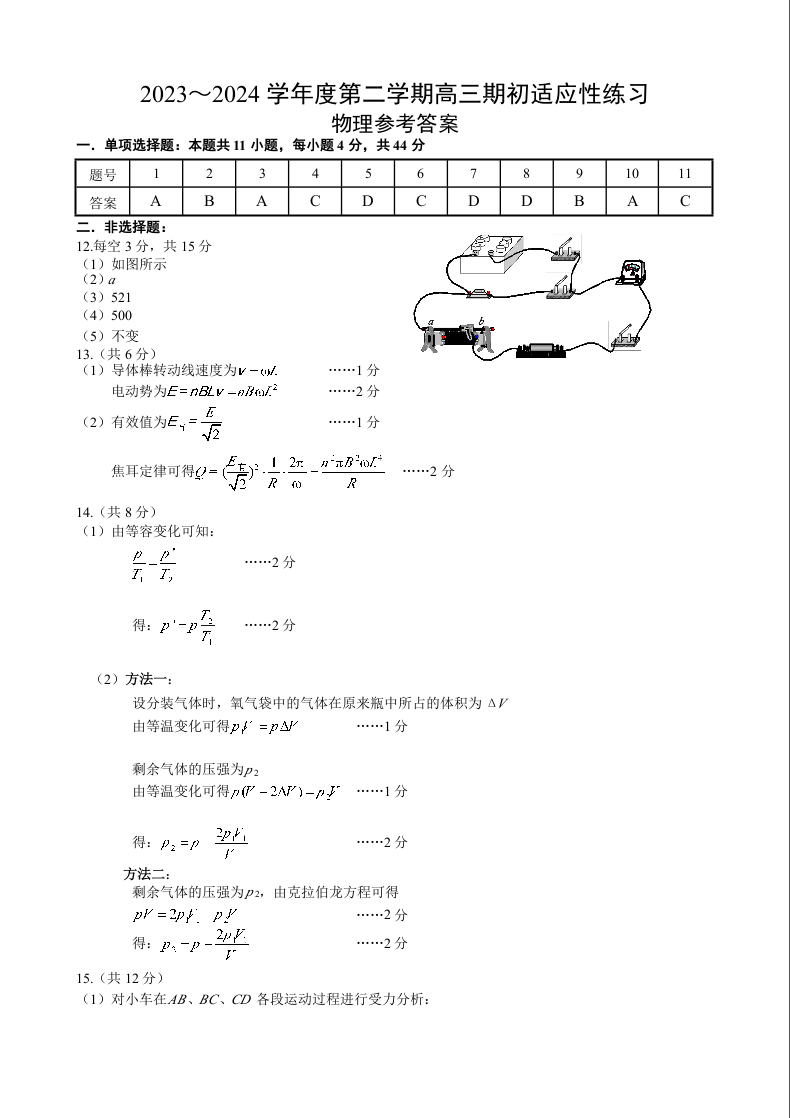 江苏省镇江市2024届高三下学期期初适应性练习物理答案