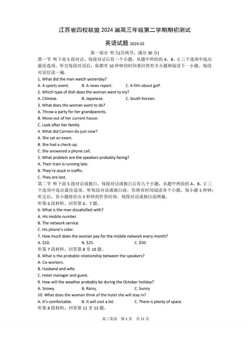江苏四校2024届(苏高中+淮阴+海门+姜堰)高三下期初考试英语+答案