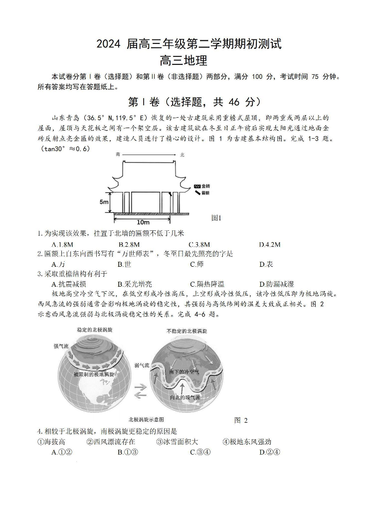 江苏四校2024届(苏高中+淮阴+海门+姜堰)高三下期初考试地理+答案