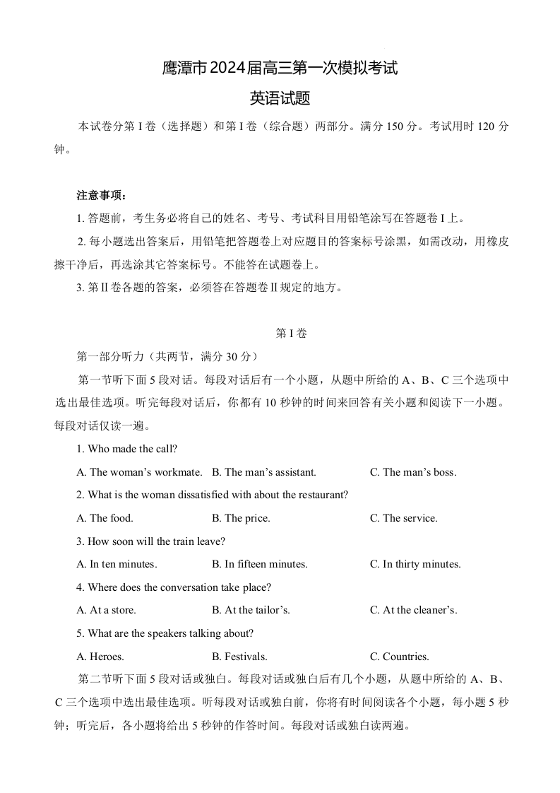 江西省鹰潭市2024届高三下学期第一次模拟考试(鹰潭一模)英语