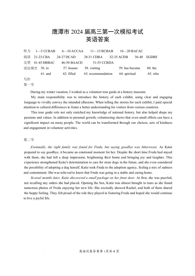 江西省鹰潭市2024届高三下学期第一次模拟考试(鹰潭一模)英语答案
