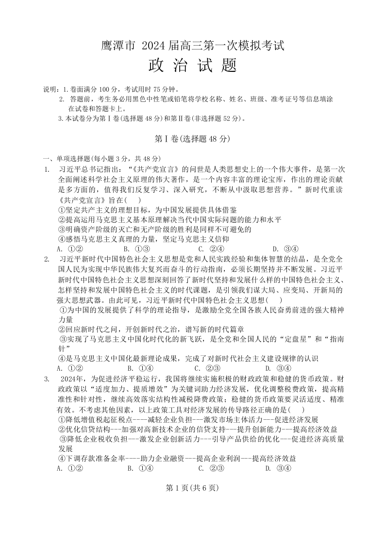 江西省鹰潭市2024届高三下学期第一次模拟考试(鹰潭一模)政治