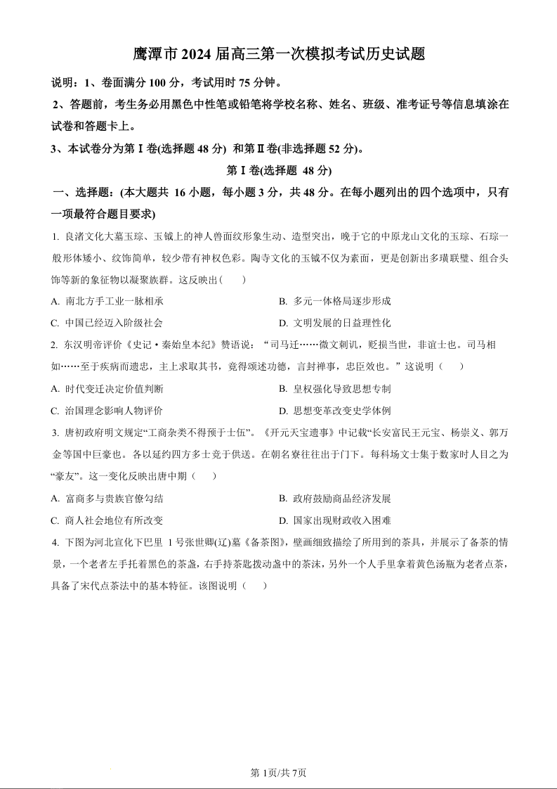 江西省鹰潭市2024届高三下学期第一次模拟考试(鹰潭一模)历史(原卷版)