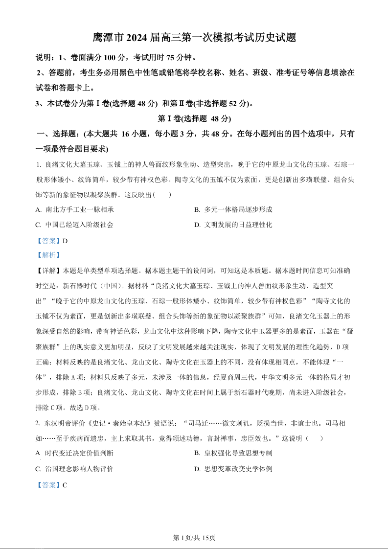 江西省鹰潭市2024届高三下学期第一次模拟考试(鹰潭一模)历史(精品解析版)