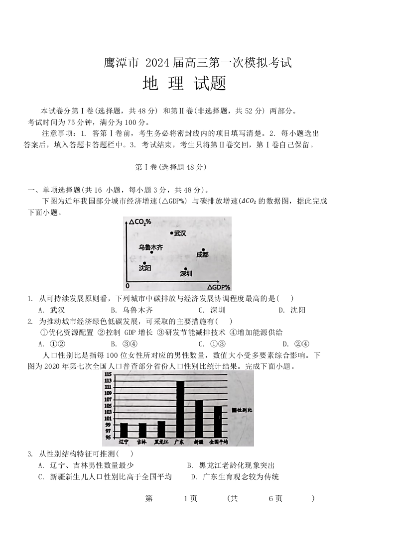 江西省鹰潭市2024届高三下学期第一次模拟考试(鹰潭一模)地理
