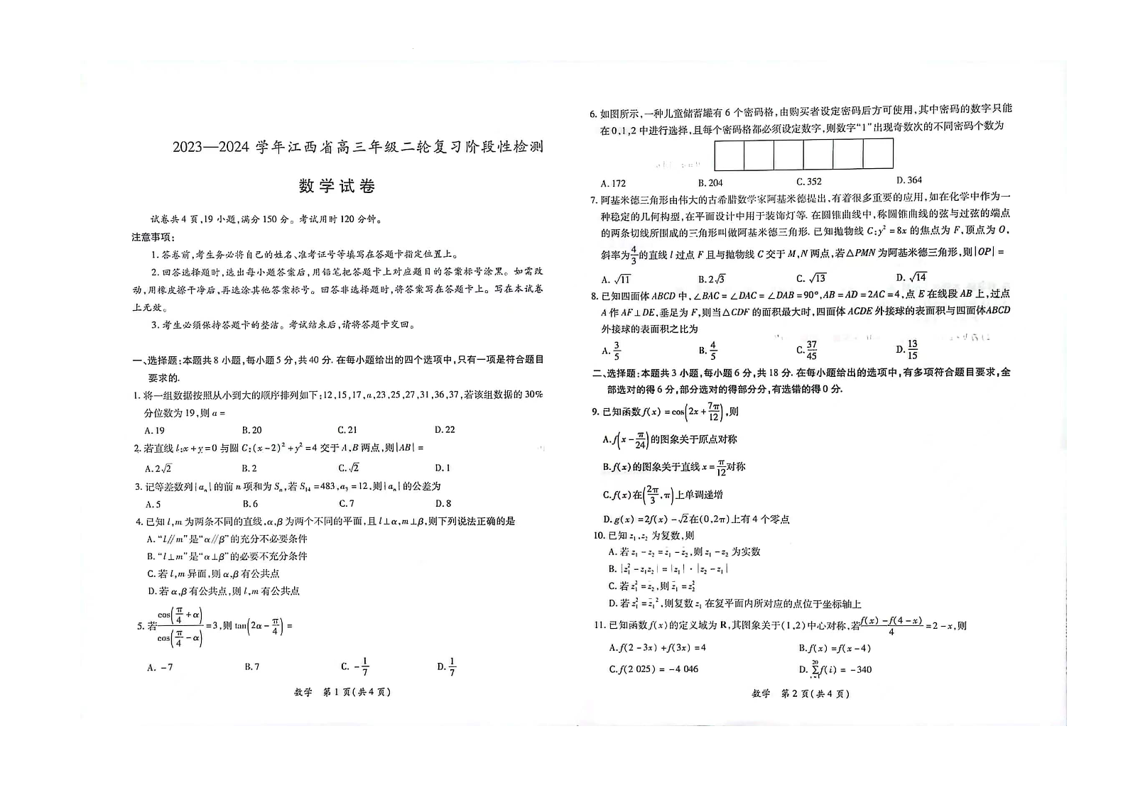 江西稳派上进联考2024届高三年级二轮复习阶段性测试数学