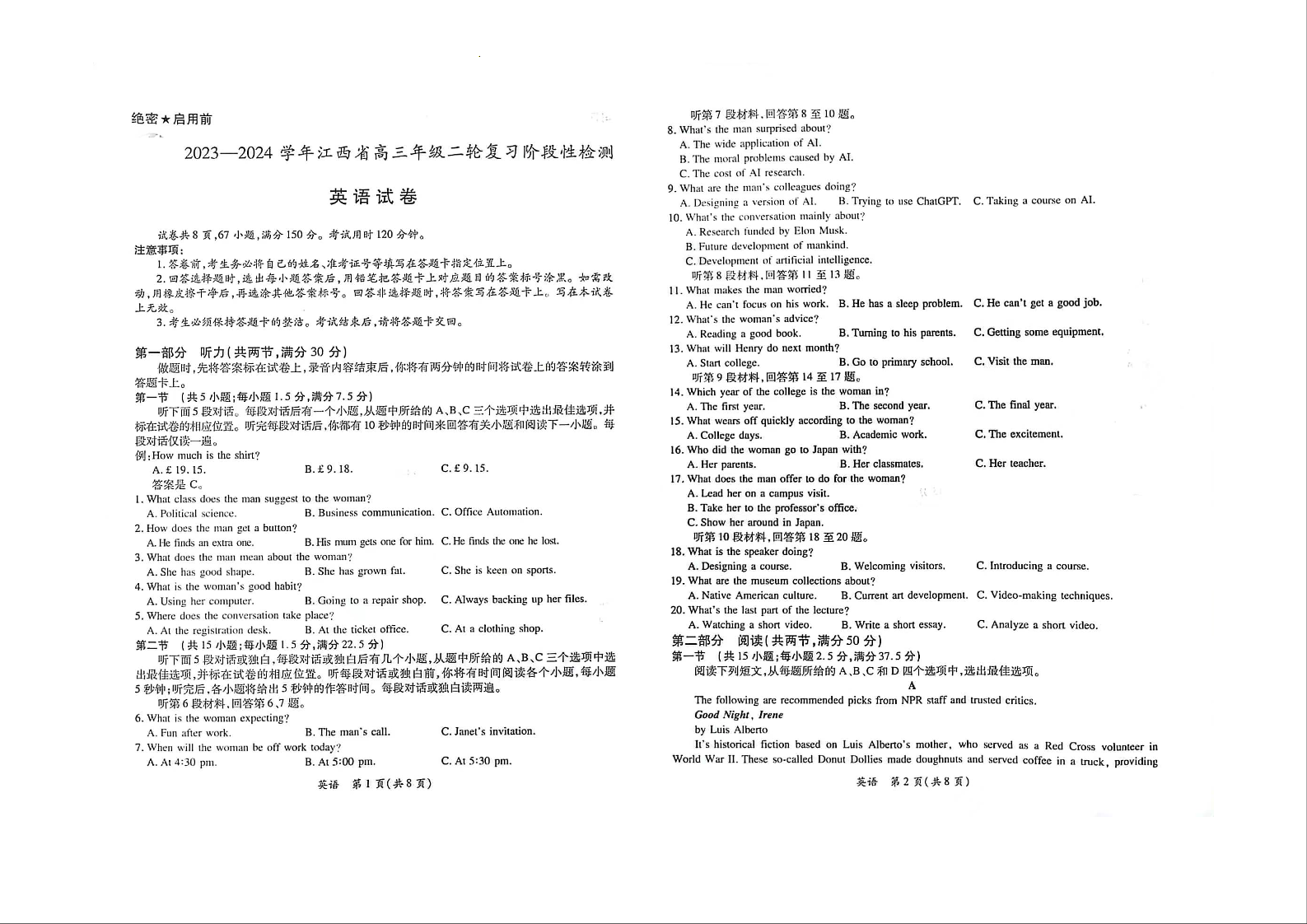 江西稳派上进联考2024届高三年级二轮复习阶段性测试英语