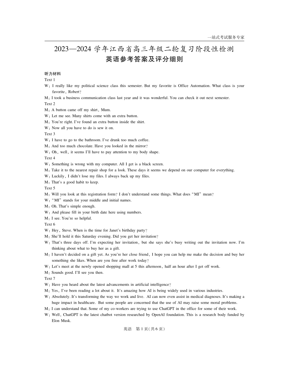 江西稳派上进联考2024届高三年级二轮复习阶段性测试英语答案