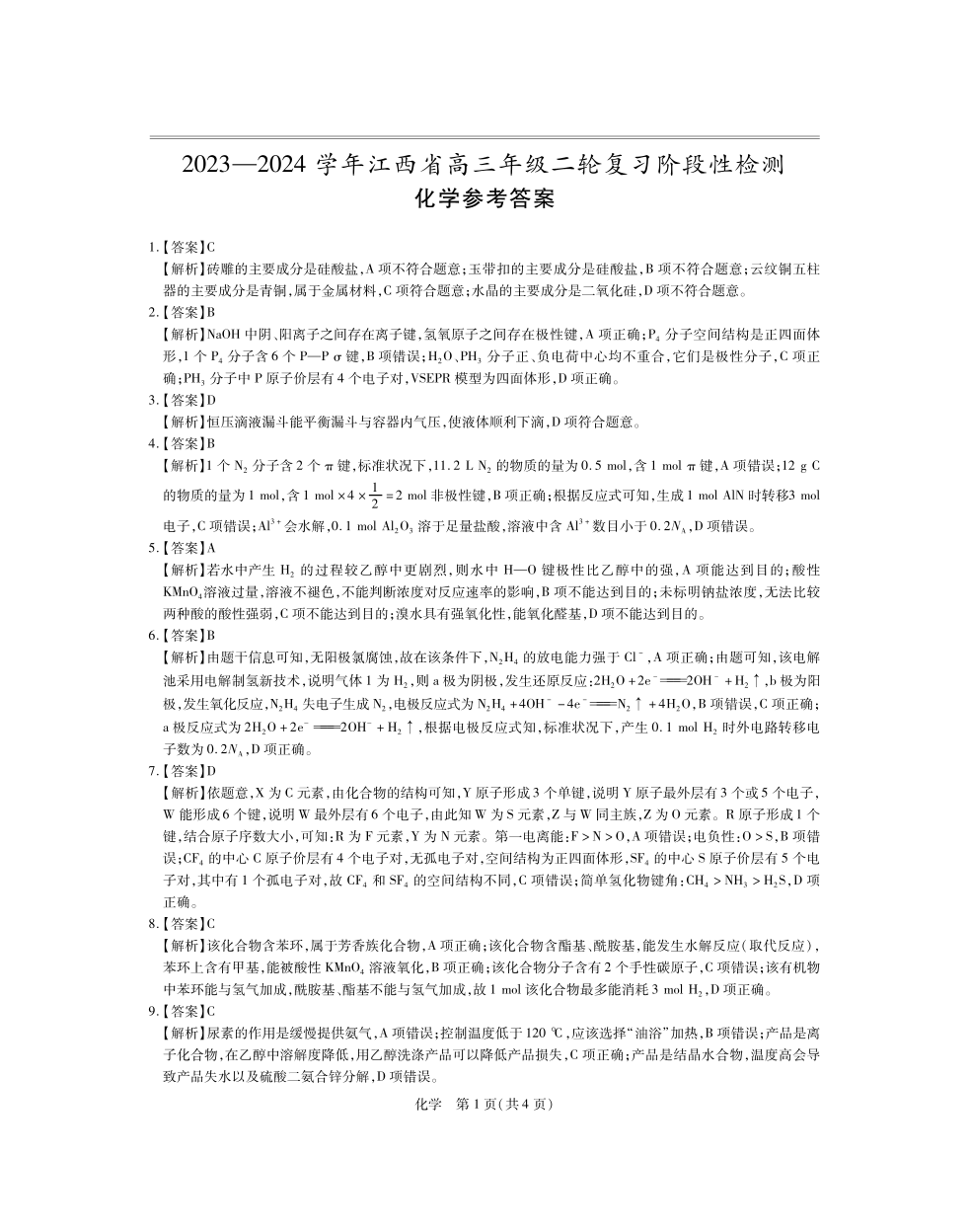 江西稳派上进联考2024届高三年级二轮复习阶段性测试化学答案