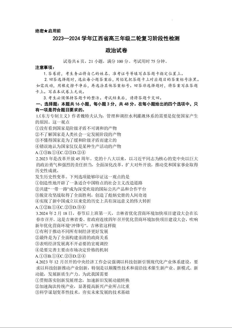 江西稳派上进联考2024届高三年级二轮复习阶段性测试政治+答案