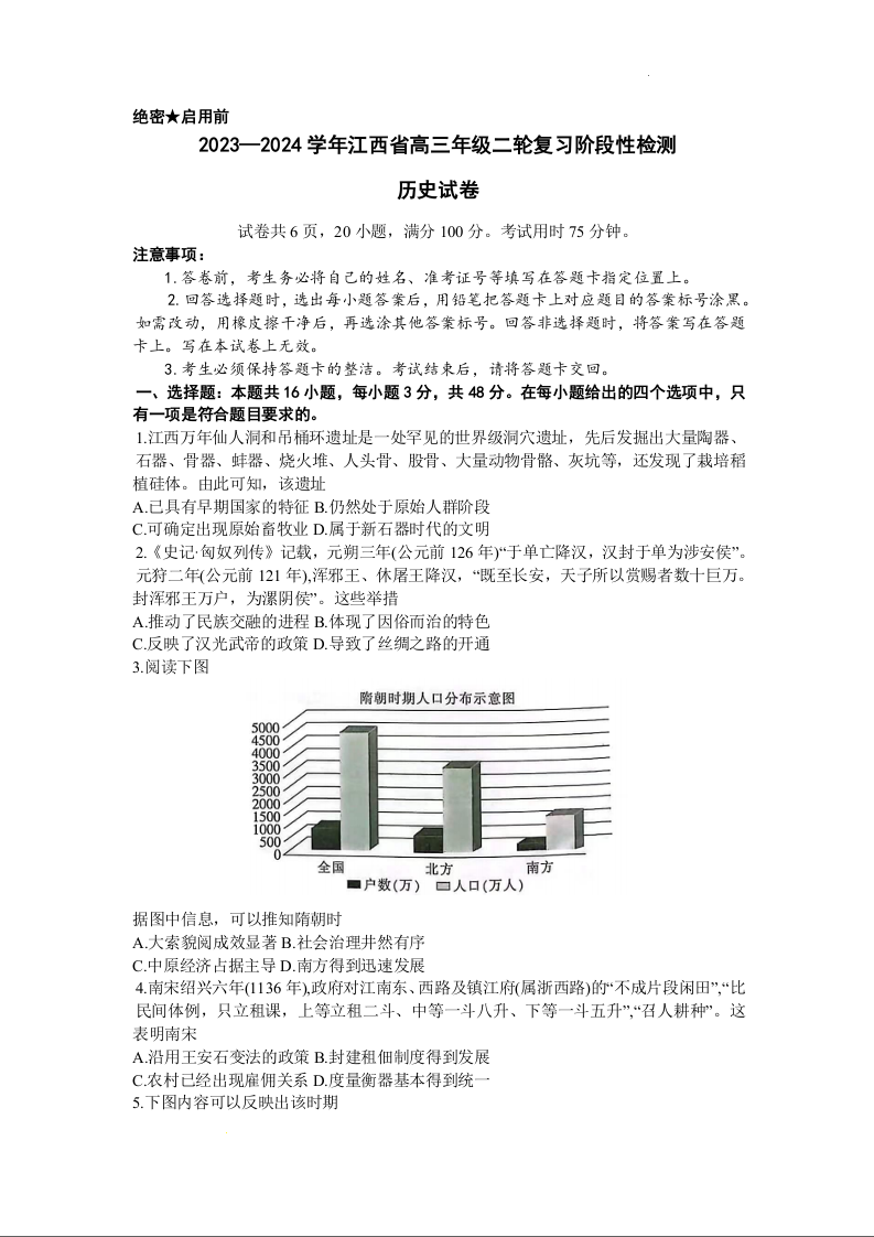 江西稳派上进联考2024届高三年级二轮复习阶段性测试历史+答案