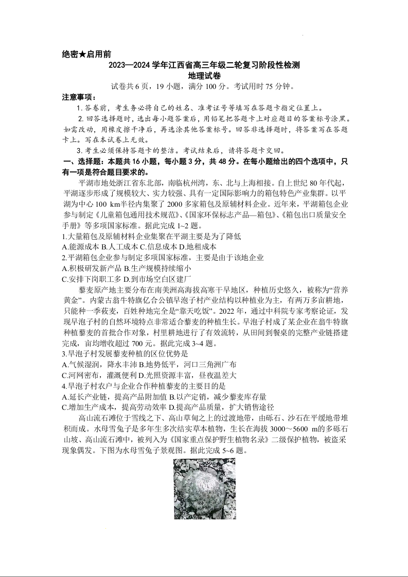 江西稳派上进联考2024届高三年级二轮复习阶段性测试地理+答案