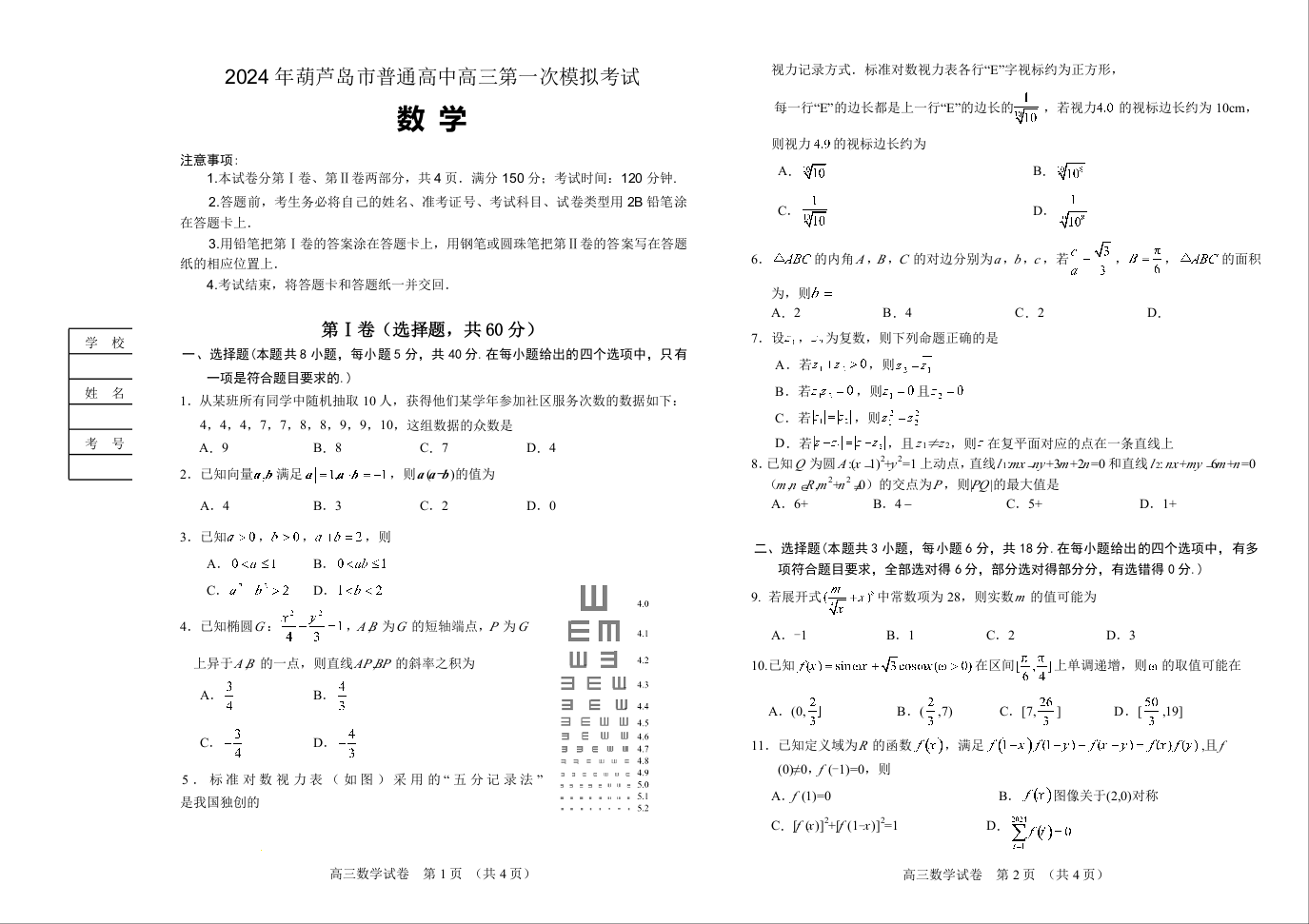 辽宁省葫芦岛市2024年普通高中高三年级下学期第一次模拟考试数学