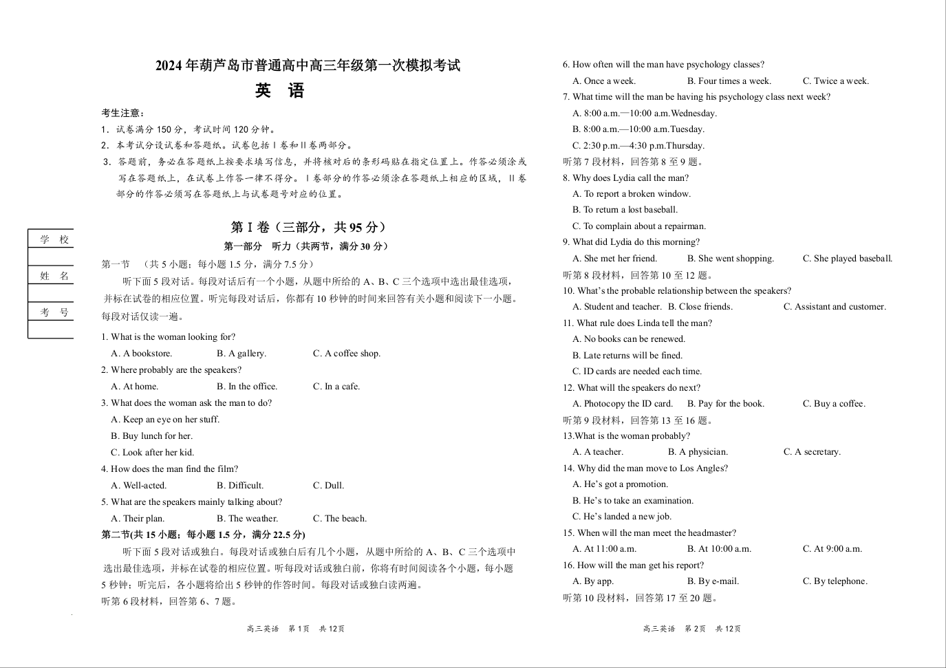 辽宁省葫芦岛市2024年普通高中高三年级下学期第一次模拟考试英语