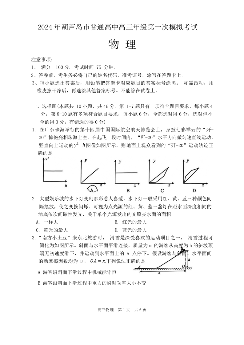 辽宁省葫芦岛市2024年普通高中高三年级下学期第一次模拟考试物理+答案