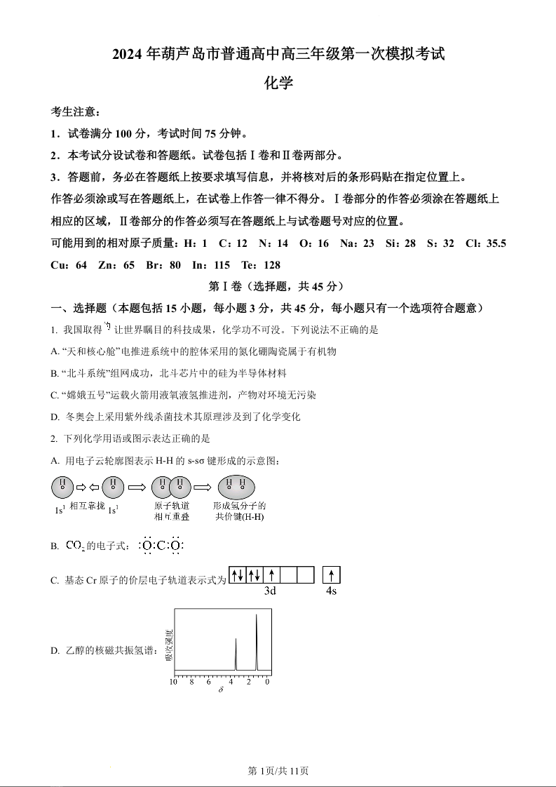 辽宁省葫芦岛市2024年普通高中高三年级下学期第一次模拟考试化学(原卷版)