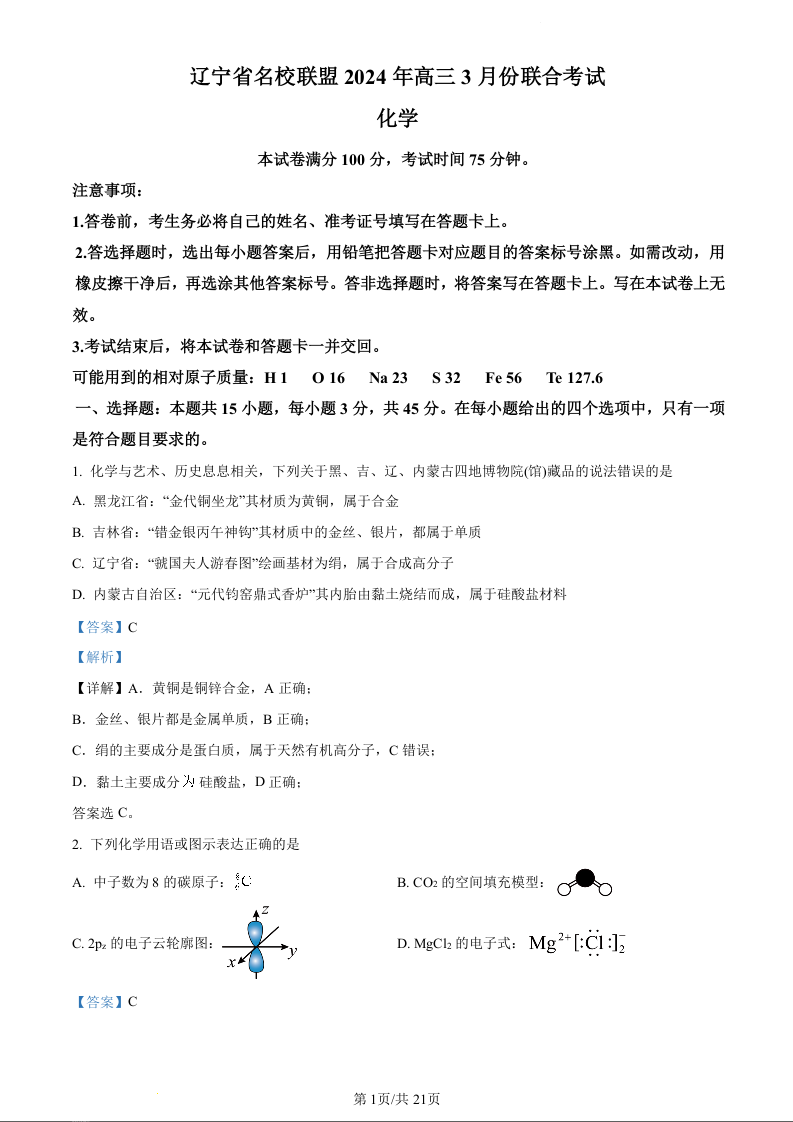 辽宁省名校联盟2024届高三下学期3月份联合考试化学(精品解析版)