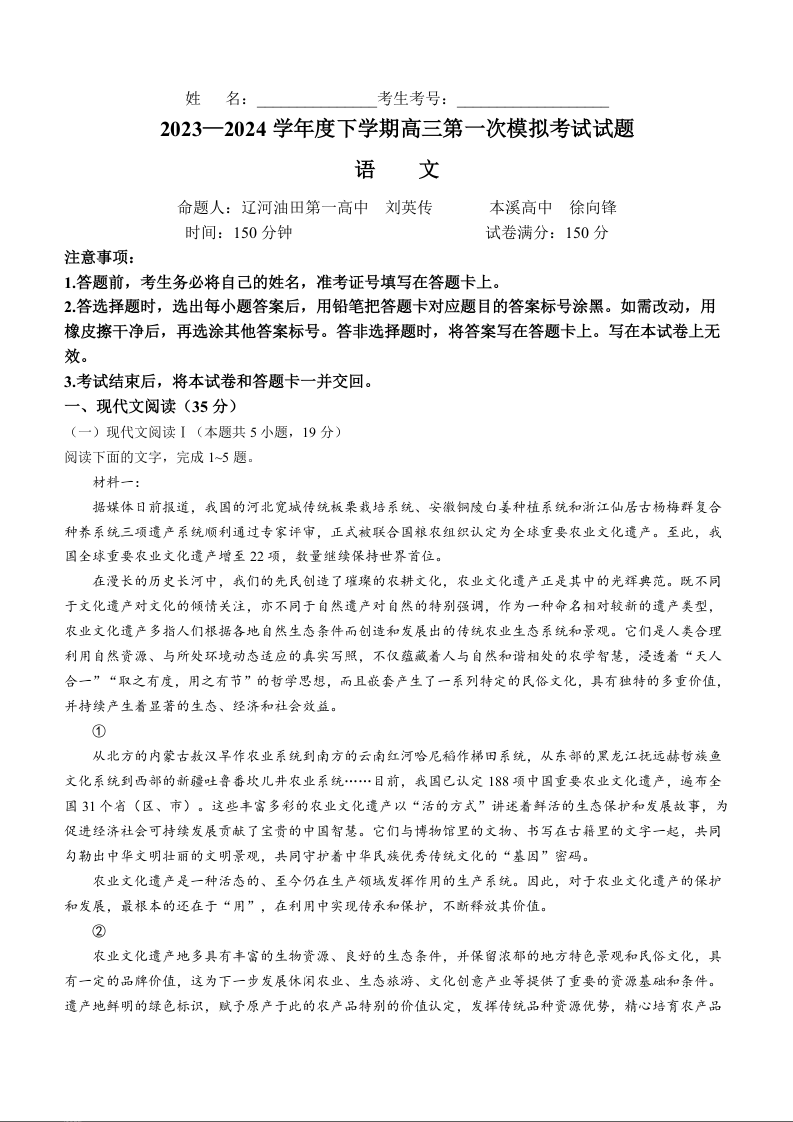 辽宁省协作校2024届高三下学期第一次模拟考试语文