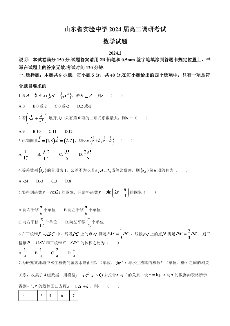 山东省实验中学2024届高三下学期2月调研考试数学+答案