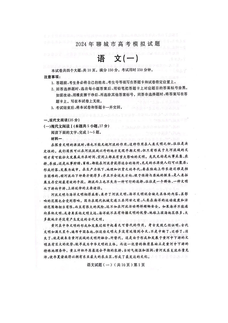 山东省聊城市2024年高考模拟试题(一) 语文