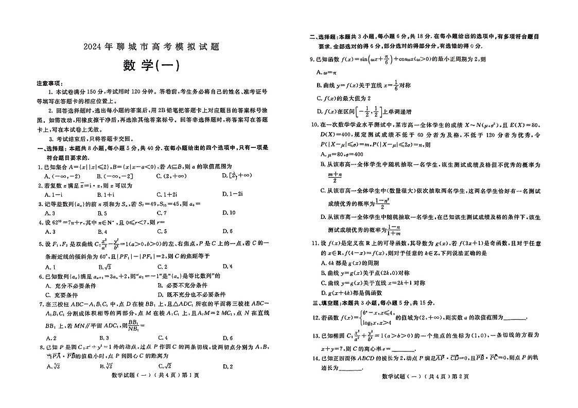 山东省聊城市2024年高考模拟试题(一)数学