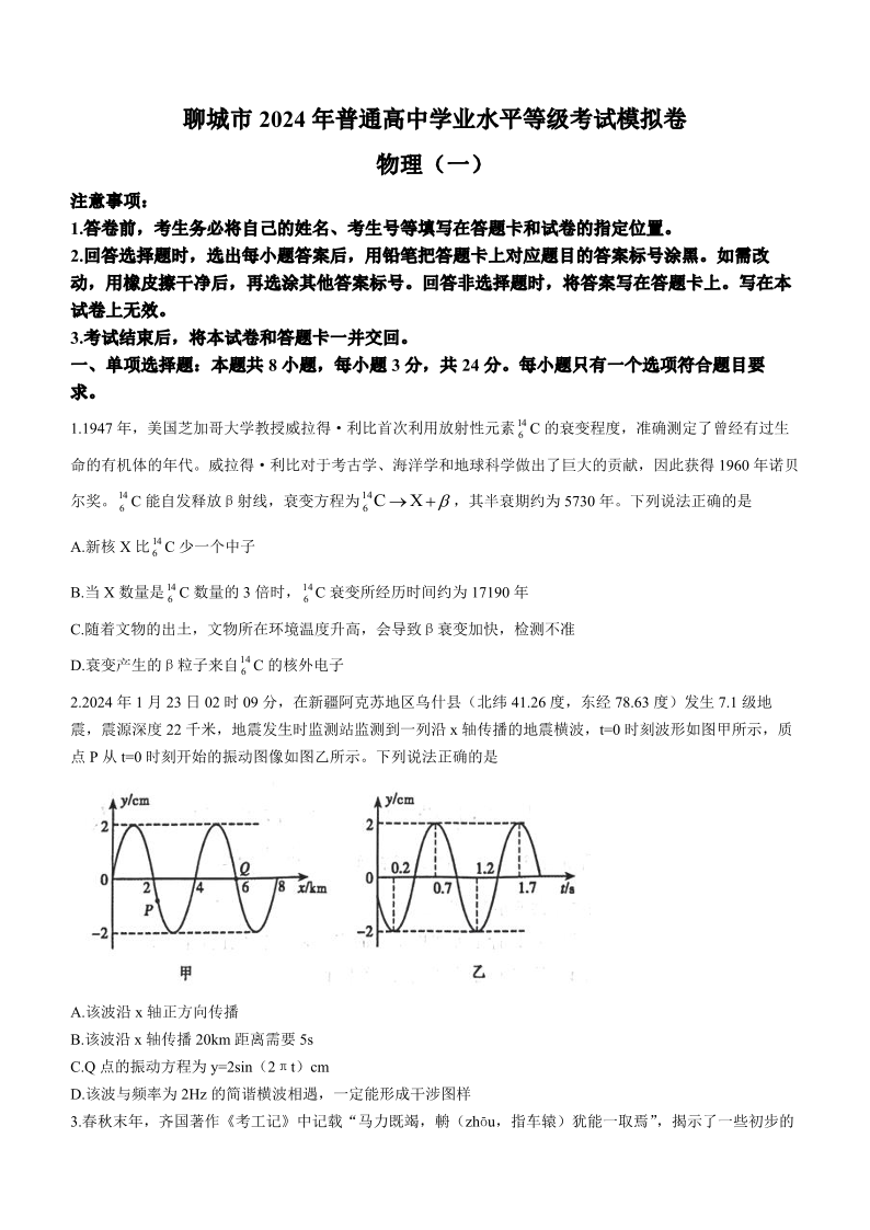 山东省聊城市2024年高考模拟试题(一)物理