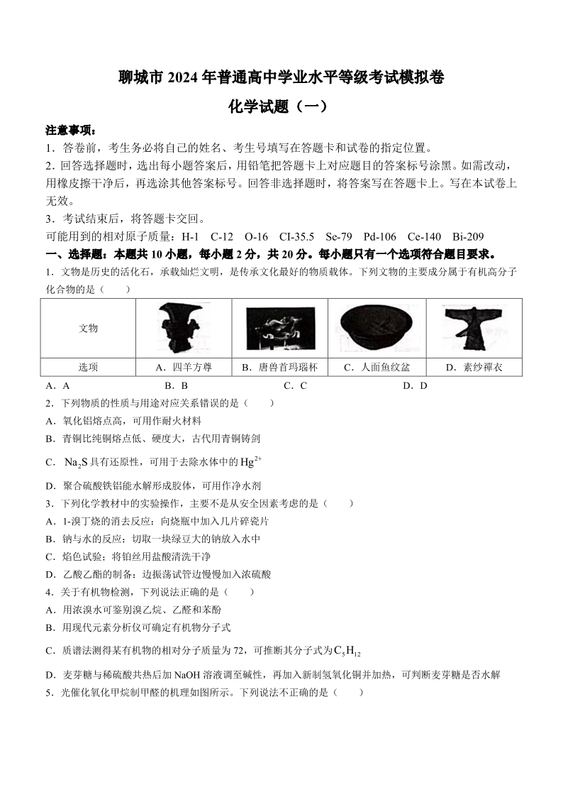 山东省聊城市2024年高考模拟试题(一)化学