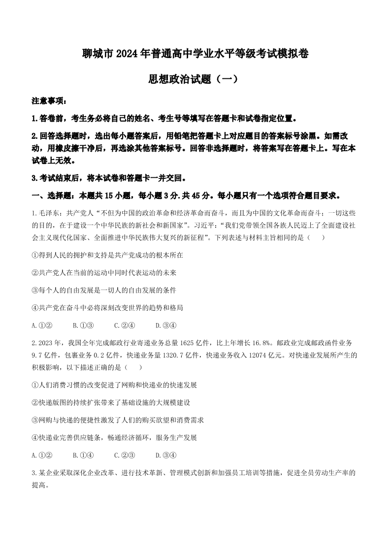 山东省聊城市2024年高考模拟试题(一)政治