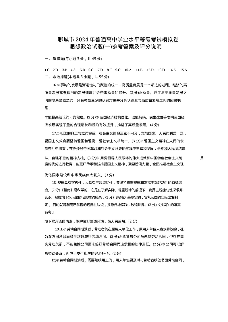 山东省聊城市2024年高考模拟试题(一)政治答案
