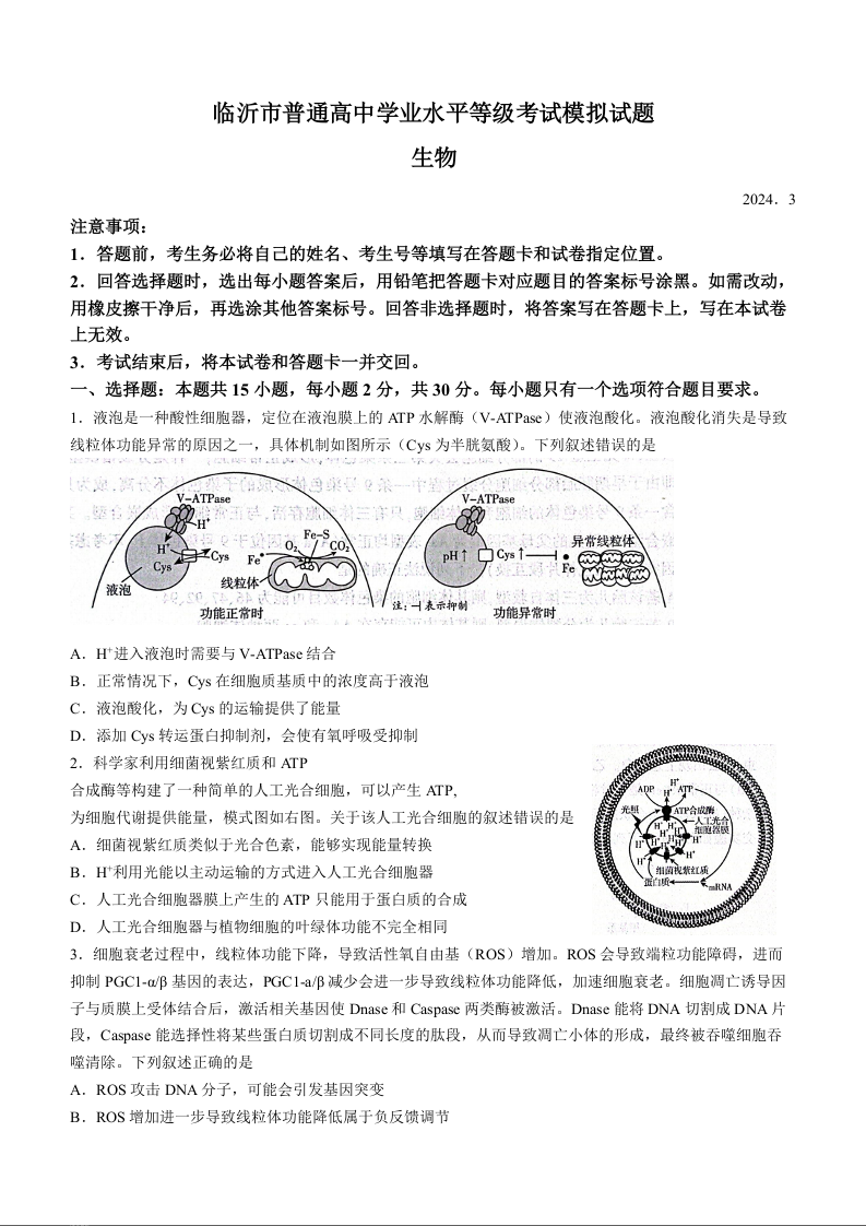 山东省临沂市2024届高三下学期3月一模考试生物