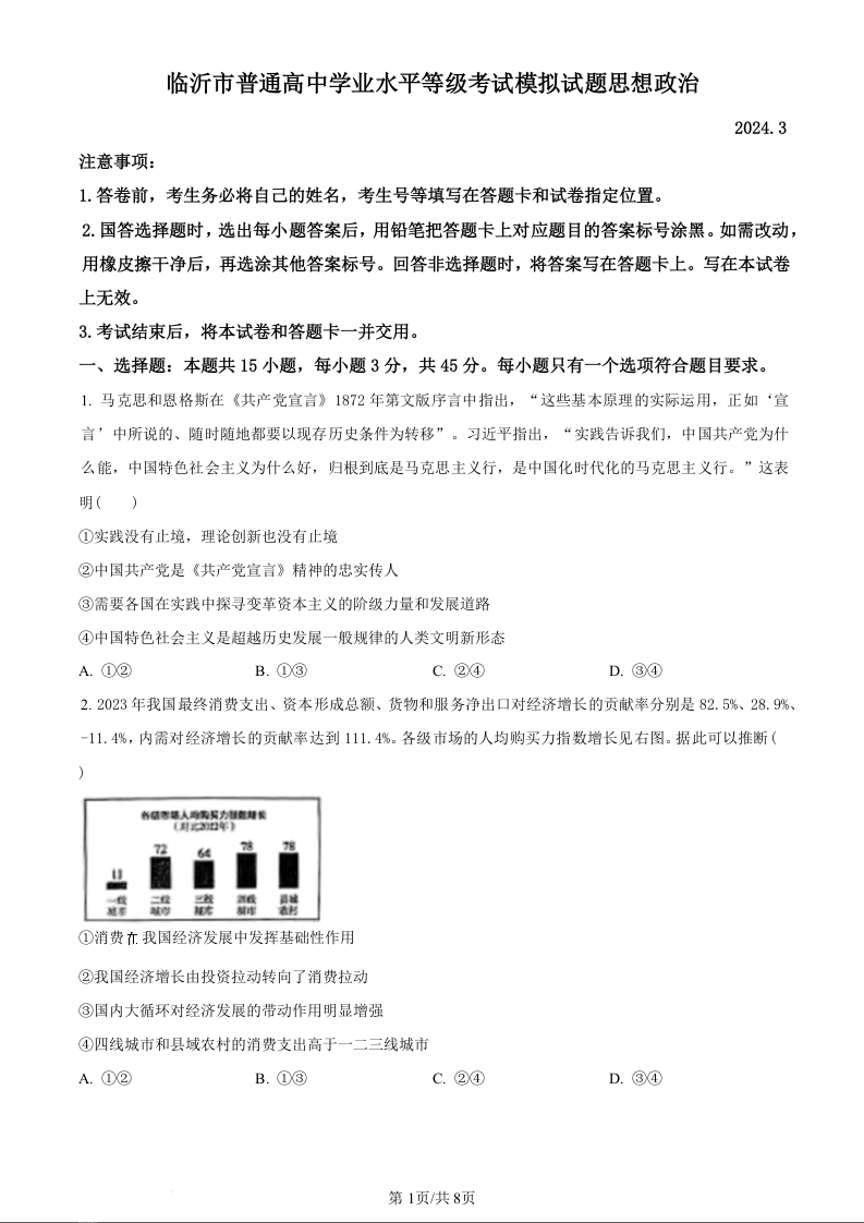 山东省临沂市2024届高三下学期3月一模考试政治(原卷版)