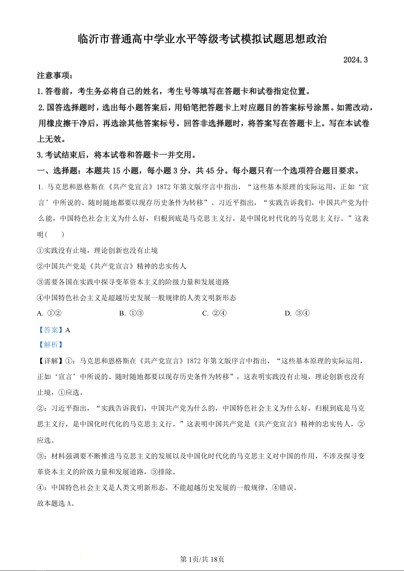 山东省临沂市2024届高三下学期3月一模考试政治(精品解析版)
