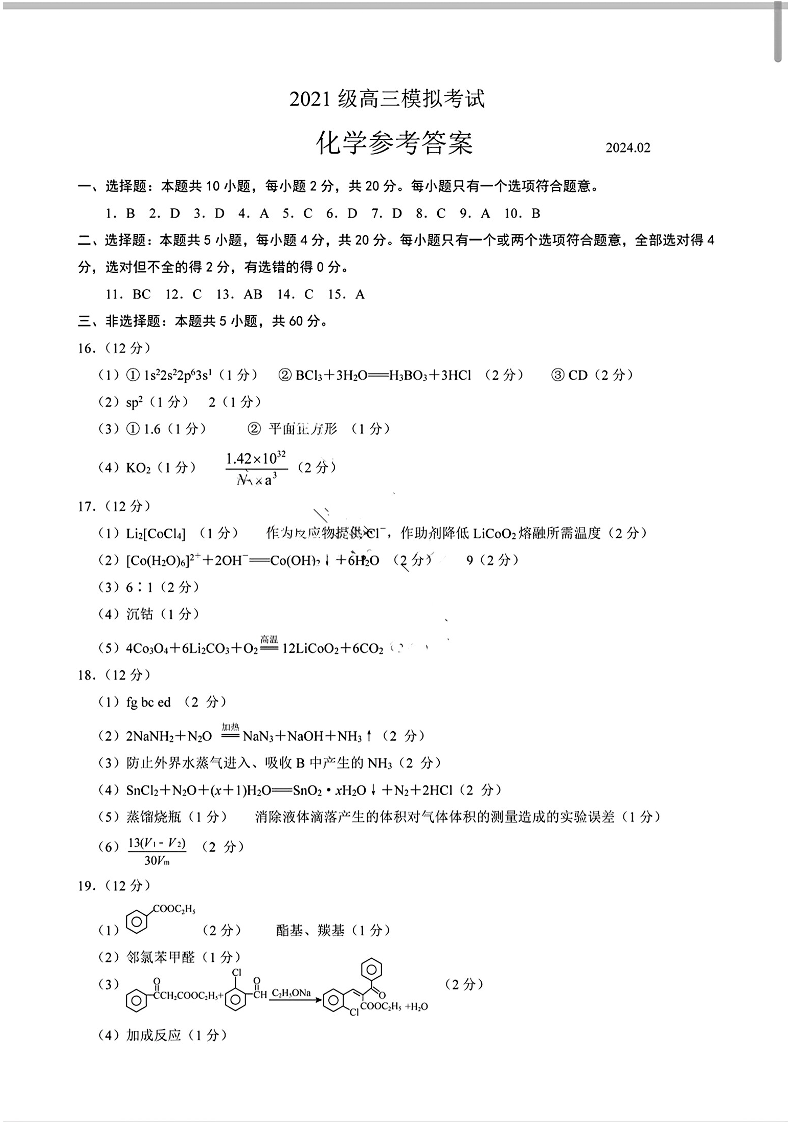 山东省日照市2024届校际联合考试高三一模(2月)化学答案