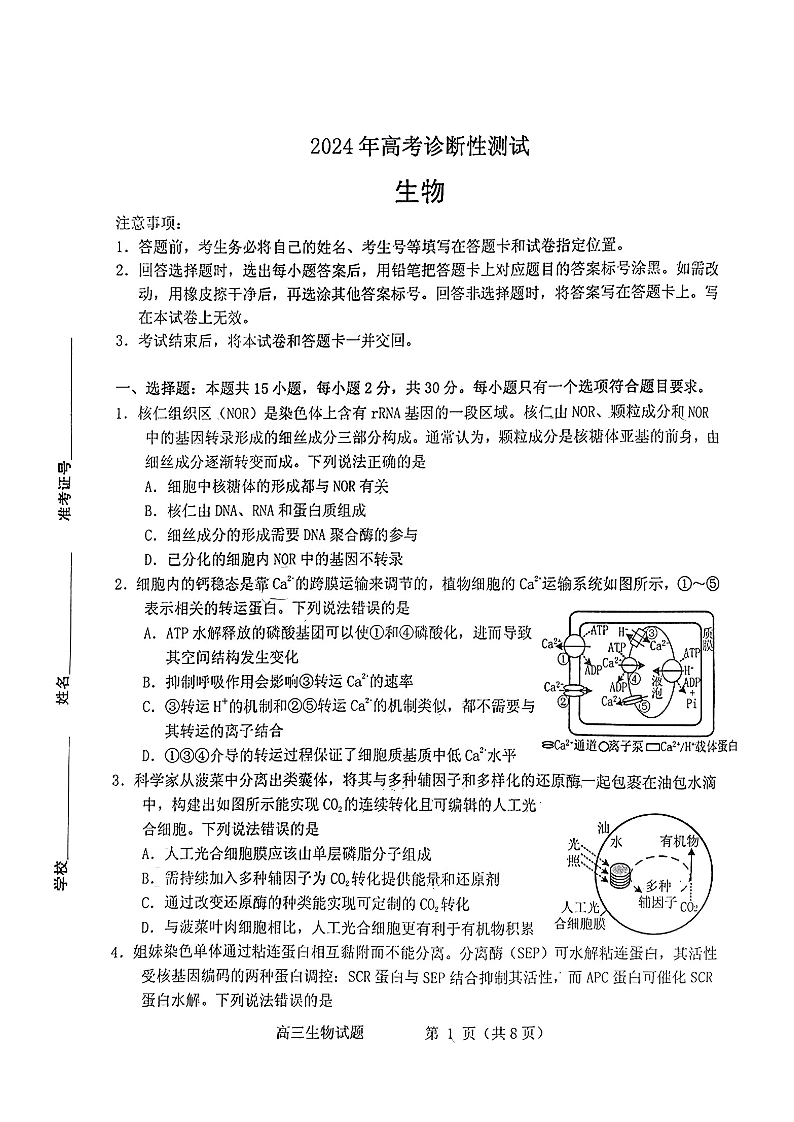 山东省烟台德州东营2024年高考诊断性测试(一模)生物