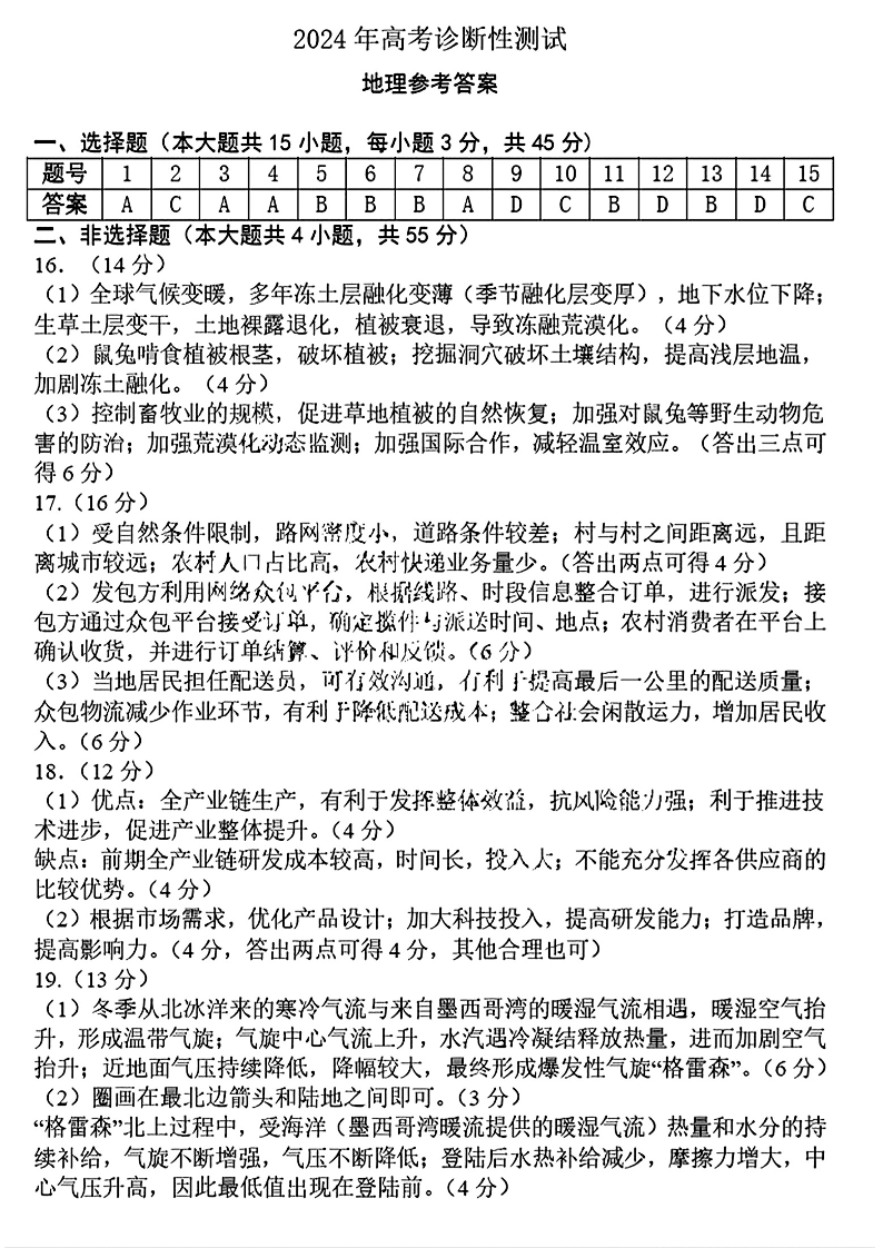 山东省烟台德州东营2024年高考诊断性测试(一模)地理答案