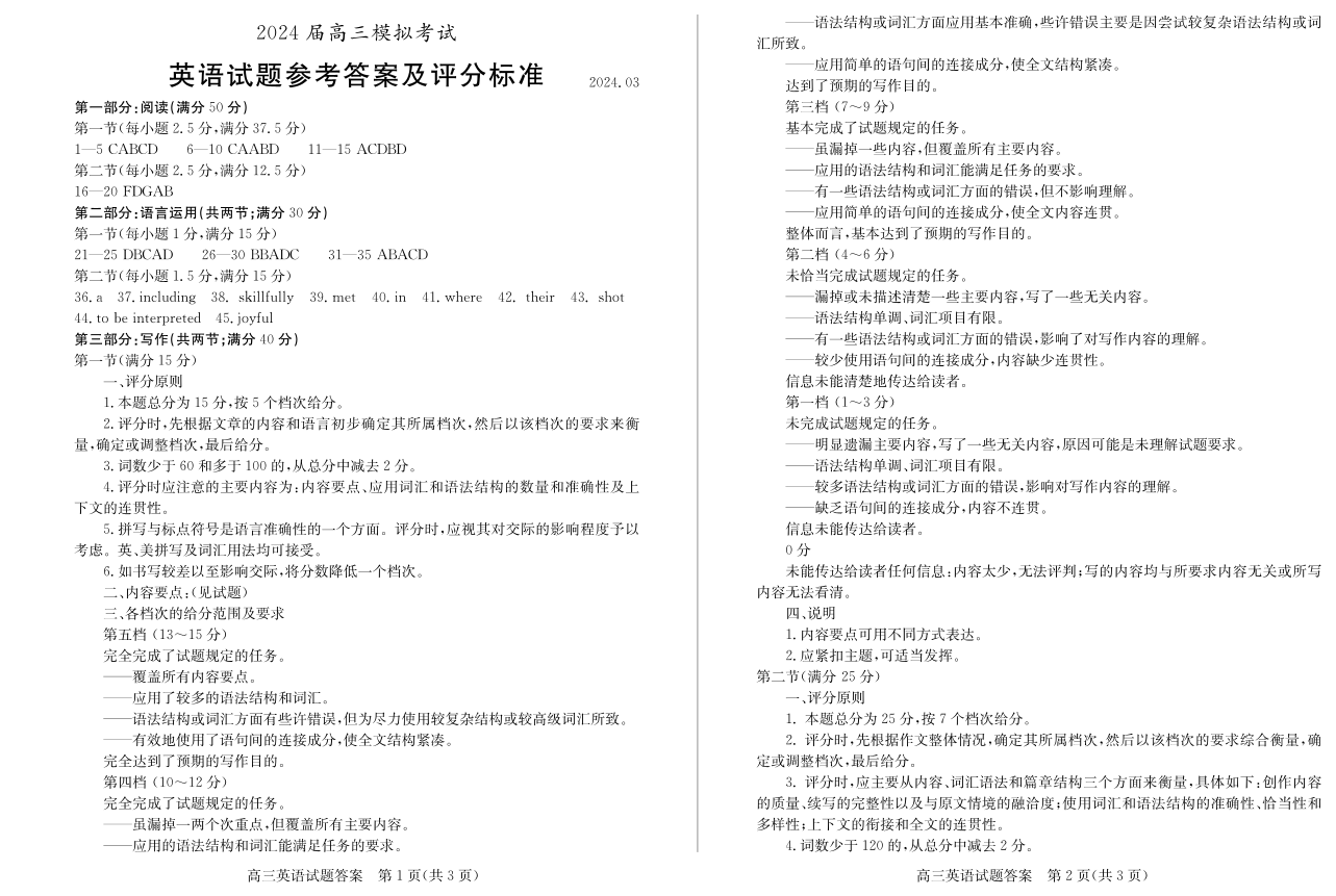 山东省枣庄市2024届高三下学期3月模拟考试(枣庄二模)英语答案