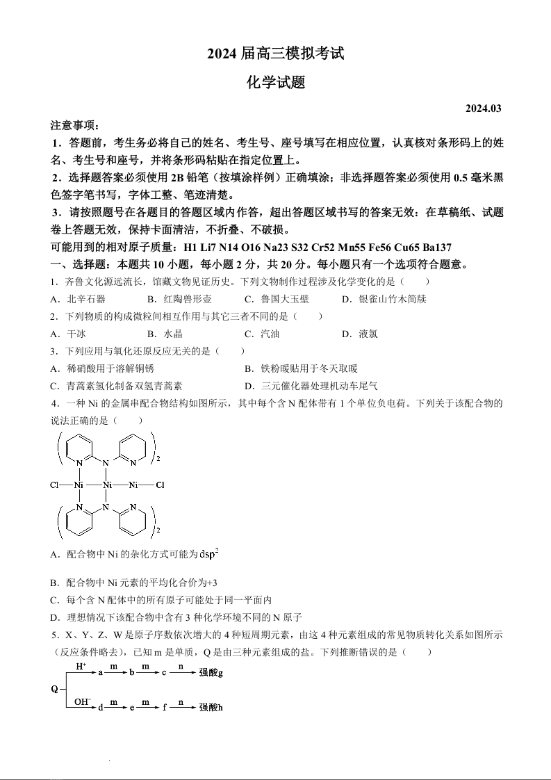 山东省枣庄市2024届高三下学期3月模拟考试(枣庄二模)化学+答案