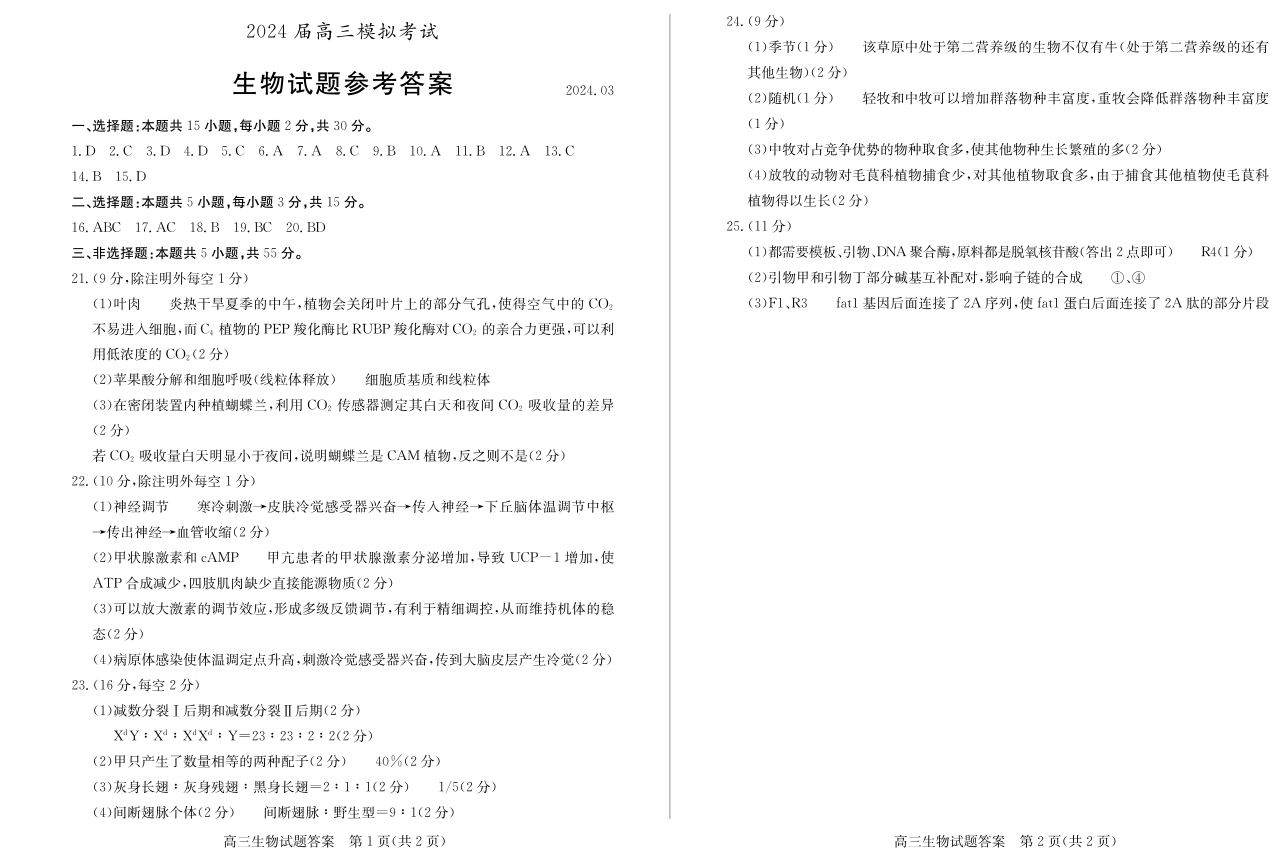 山东省枣庄市2024届高三下学期3月模拟考试(枣庄二模)生物答案