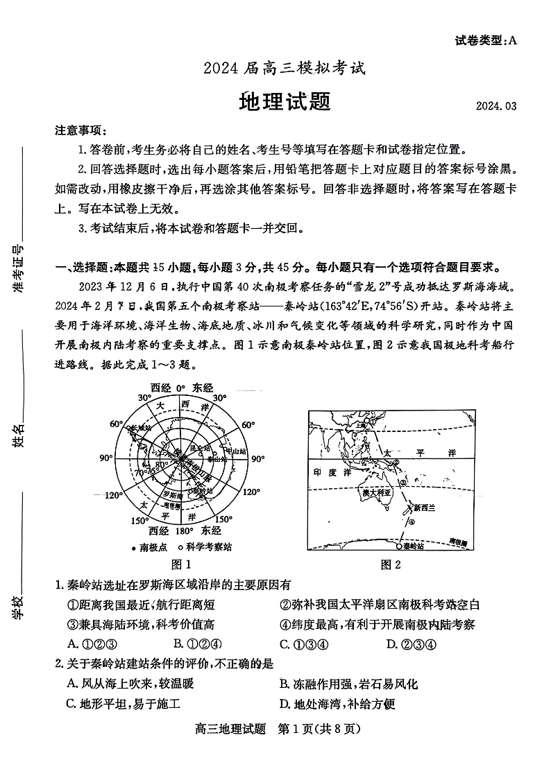 山东省枣庄市2024届高三下学期3月模拟考试(枣庄二模)地理