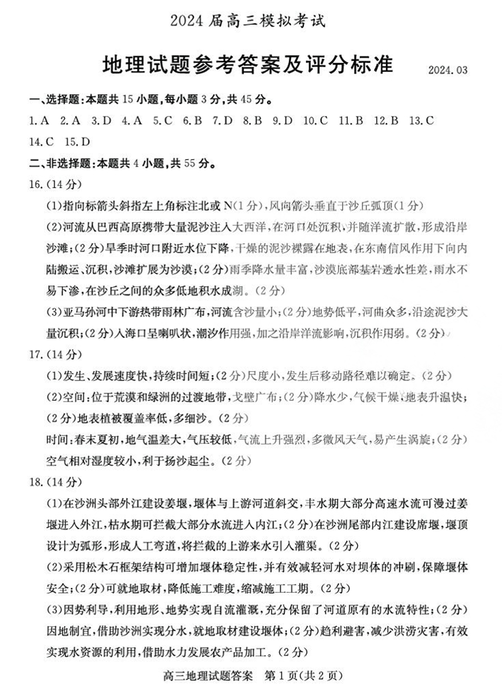 山东省枣庄市2024届高三下学期3月模拟考试(枣庄二模)地理答案