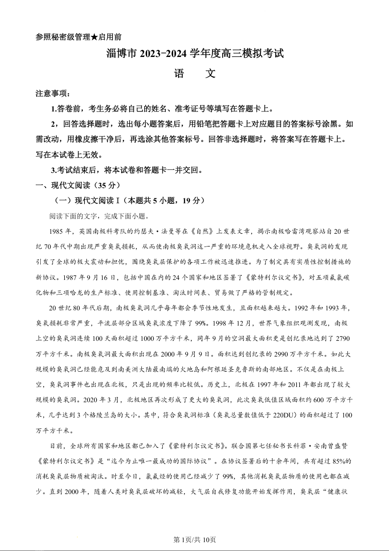 山东省淄博市2024届高三下学期一模考试语文(原卷版)