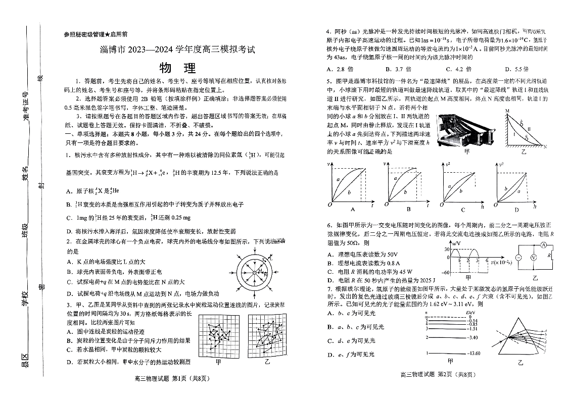 山东省淄博市2024届高三下学期一模考试物理