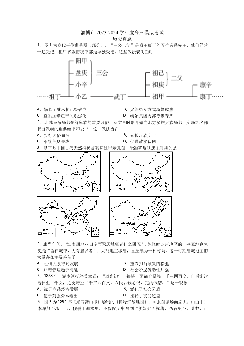 山东省淄博市2024届高三下学期一模考试历史