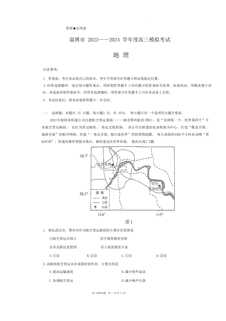 山东省淄博市2024届高三下学期一模考试地理+答案