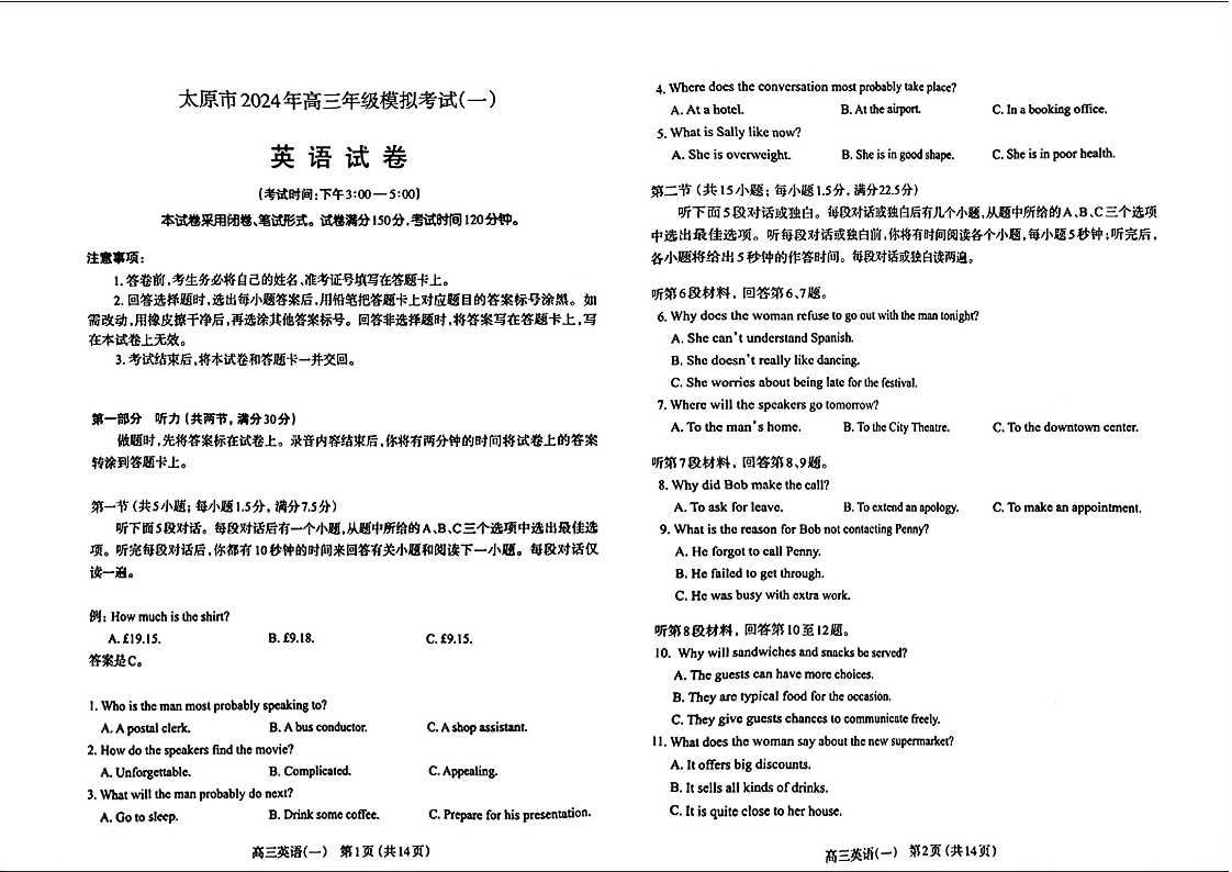 山西省太原市2024届高三下学期模拟考试(一)(太原一模)英语