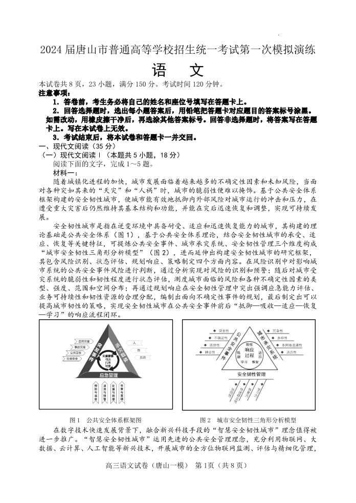 唐山市2024 届普通高中学业水平选择性考试第一次模拟演练(唐山一模)语文+答案