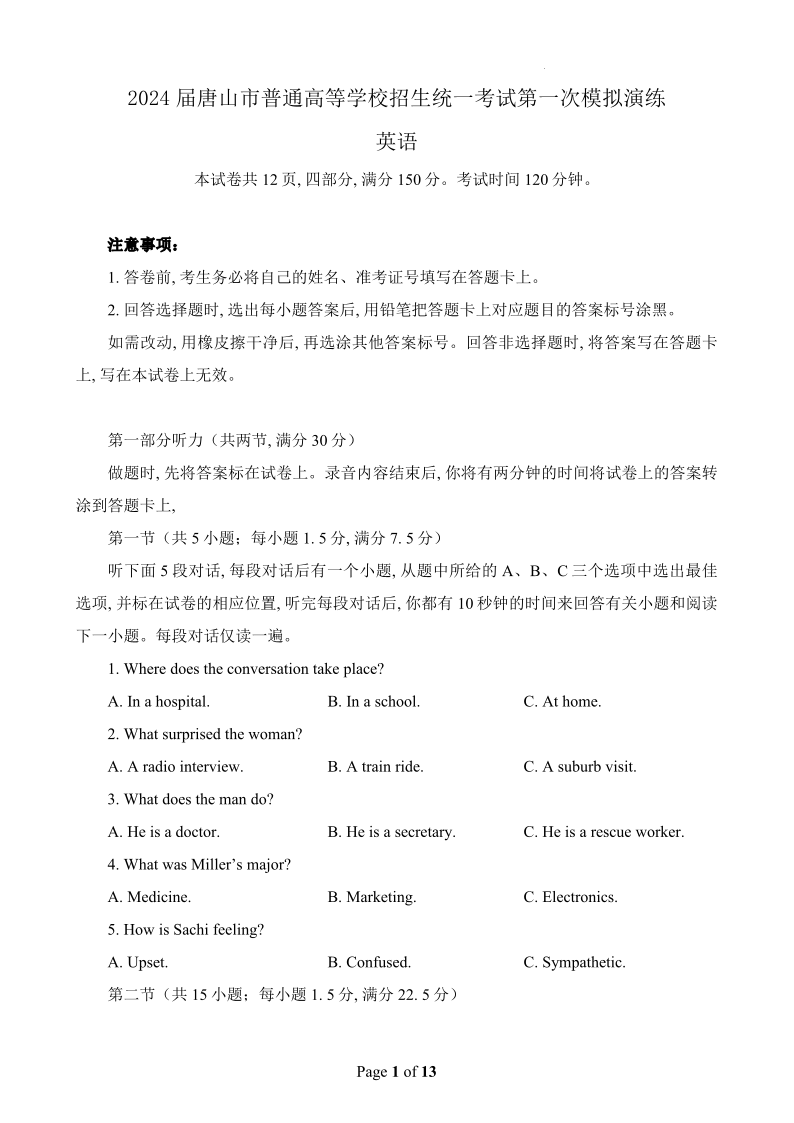 唐山市2024 届普通高中学业水平选择性考试第一次模拟演练(唐山一模)英语