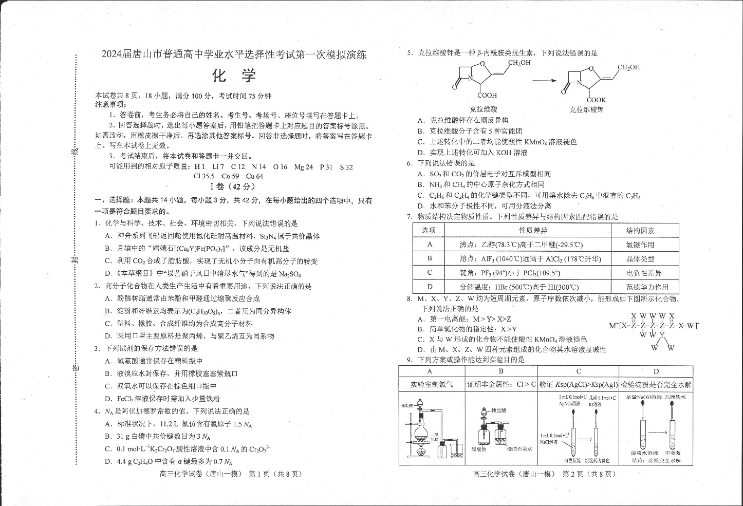 唐山市2024 届普通高中学业水平选择性考试第一次模拟演练(唐山一模)化学
