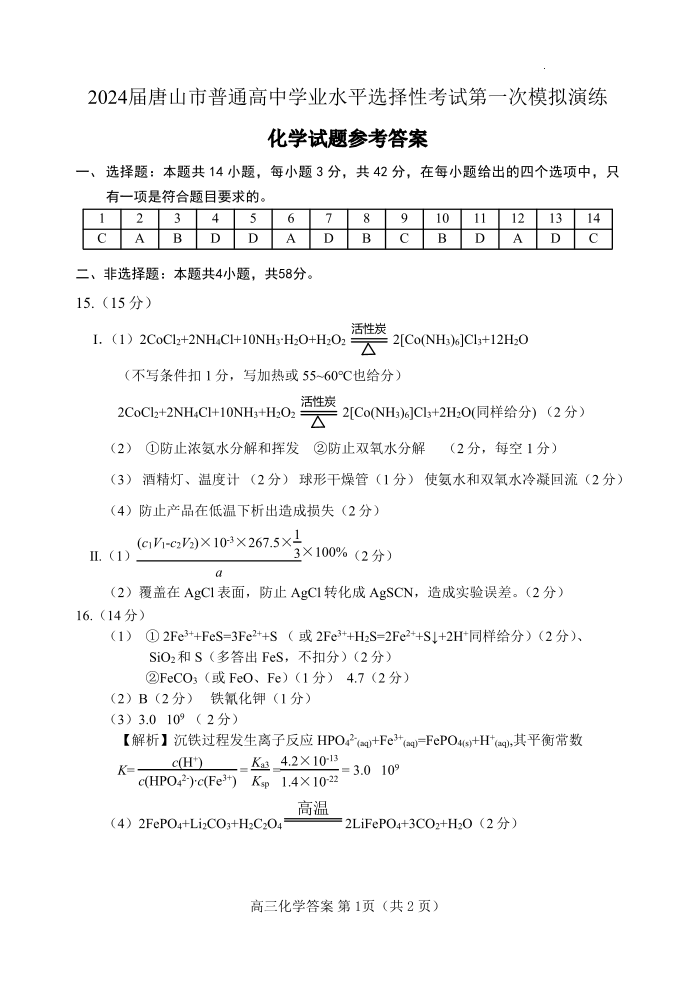 唐山市2024 届普通高中学业水平选择性考试第一次模拟演练(唐山一模)化学答案
